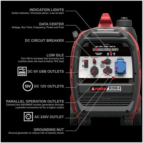 Der SC2300i-H ist mit einem Überlastungsschalter und einem Ölmangelschutz ausgestattet, der Ihnen anzeigt, wann Sie Öl nachfüllen müssen.der intelligente automatische Spannungsregler (AVR) und der Trennschalter sorgen für Ihre Sicherheit und die Ihrer Geräte.Wenn der Ölstand unter einen festgelegten Mindeststand fällt, schaltet sich der Stromerzeuger automatisch ab
