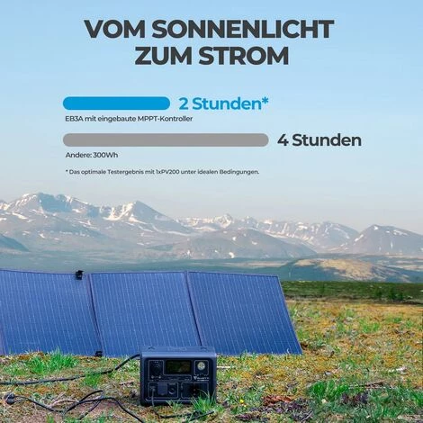 - Ultraschnelles Laden: kein sperriger Power-Brick, ein einziges Kabel reicht aus, um EB3A mit maximal 350 W aufzuladen. Sie können auch PV+AC zusammen verwenden, um 80 % in nur 30 Minuten aufzuladen (Solar-Ladekabel nicht im Lieferumfang enthalten).