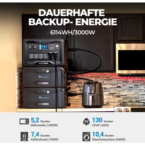 [Erweiterbare Backup-Batterie für Zuhause] – BLUETTI AC300 & B300 ist ein 100 % modulares Stromversorgungssystem. Ein AC300-Master-Modul arbeitet mit bis zu 4 externen B300-Akkupacks (jeweils 3.072 Wh) und erweitert die Kapazität von 3072 Wh auf 24576 Wh mit Erweiterungsakkus B300, Fusion Box Pro (P030A), Smart-Home-Panel. Versorgen Sie die Grundbedürfnisse Ihrer ganzen Familie tagelang bei Notfällen oder Stromausfällen.