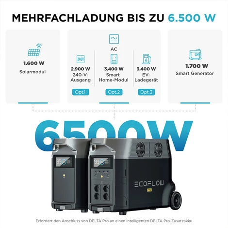 【Mehrere Ladeoptionen】 Laden Sie ihn mit Ihrer DELTA Pro auf, indem Sie Solarmodule, einen Stromnetzanschluss oder ein 12-V-Kfz-Ladekabel verwenden, oder laden Sie ihn mit einem EcoFlow Smart Generator per 1,8-kWh-DC-Schnelladung direkt auf.