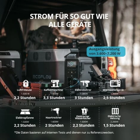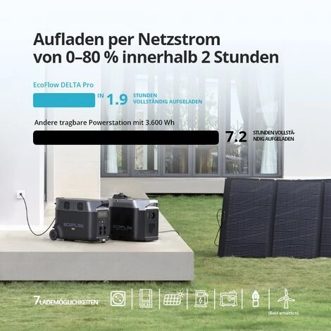 - 5 Ladeoptionen: Wählen Sie zwischen der Ladestation für Elektrofahrzeuge, Solarpanels, Wandsteckdosen, dem intelligenten Outdoor-Generator oder dem Bordnetzanschluss im Fahrzeug. Vereint verschiedene Methoden, um 6500 W zu erreichen (mit einem zusätzlichen Akku). Schneller als jeder andere Solar-Generator.