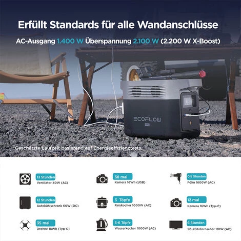 【Versorgt nahezu jedes Gerät】: Der 1400-W-AC-Ausgang und die 9 Anschlüsse ermöglichen die Stromversorgung von Geräten wie Laptops, Geschirrspülern und Kühlschränken. Hervorragend als Outdoor-Generator oder für Rückwärtsstrom. Mit X-Boost können Sie Geräte mit bis zu 2200 W versorgen.