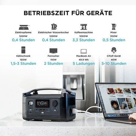 【2 AC-Steckdosen 600 W und 288 WH】 Die tragbare Elektrozentrale RIVER kann bis zu 9 Geräte gleichzeitig versorgen. Dank der 2 reinen Sinuswellen-Wechselstrom-Steckdosen kann die RIVER Elektrozentrale Geräte mit bis zu 1200 W versorgen, wenn der X-Boost Modus aktiviert ist. Mit einer Kapazität von 288 Wh liefert die Zentrale RIVER ausreichend Energie, um wichtige Geräte stundenlang zu betreiben, abhängig vom tatsächlichen Ausgang.