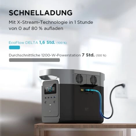 【Aufladen von 0 auf 80 % in 1 Stunde】Der DELTA Generator kann in 1 Stunde von 0 auf 80 % und in 1,6 Stunden auf 100 % geladen werden. Dank patentierter EF EcoFlow X-Stream-Technologie kann die Powerstation DELTA mit einem Standardstromkabel 10-mal schneller als die meisten auf dem Markt verfügbaren tragbaren Powerstations aufgeladen werden. (KEIN SCHWERER, SPERRIGER ADAPTER ODER AKKU).