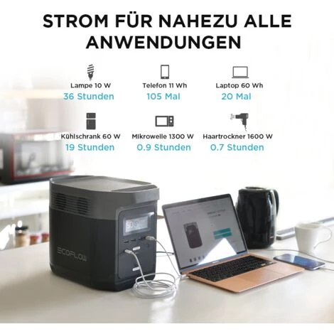 【Mehrere Ladeausgänge bieten mehr Optionen】Die DELTA verfügt über 4 x AC-Steckdose (220–240 V, 1.800 W, Spitze 3.300 W), 2 x USB-C-Anschluss, 2 x USB-A-Anschluss, 2 x USB-A-Schnellladung und 1 x Standard-DC-Kfz-Anschluss für 13,6 V, Stromversorgung für Smartphone, Laptop, Kamera, Drohnen, Geräte im Fahrzeug, CPAP-Gerät, Kühlschrank, Mixer und mehr – jederzeit und sorgenfrei.
