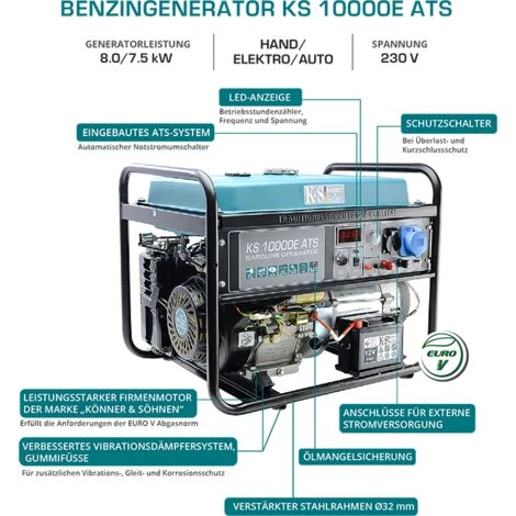 Der KS 10000E ATS Benzingenerator der deutschen Marke Könner & Söhnen ist eine ausgezeichnete Wahl für die Not- oder permanente Energieversorgung eines Hauses, einer Garage, einer Werkstatt, eines Farmbetriebs usw. Dank seiner Leistungsfähigkeit und umfassenden Funktionalität, ist er sowohl für den privaten als auch für den gewerblichen Gebrauch geeignet: in der Landwirtschaft und Industrie sowie für Versorgungs-, Straßenbau- bzw. Bauarbeiten. Der große Kraftstofftank sorgt für einen dauerhaften störungsfreien Betrieb. Ein zuverlässiger Motor von Könner & Söhnen und ein hochwertiger Alternator mit Kupferwicklung garantieren Ihnen einen störungsfreien und dauerhaften Einsatz bei maximaler Belastung. Das Vorliegen einer elektronischen Anzeige ermöglicht es, den Betrieb des Generators qualitativ zu überwachen und Wartungsarbeiten rechtzeitig auszuführen. Der intelligente automatische Spannungsregler (AVR) und der Schutzschalter gewährleisten Sicherheit für Sie und Ihre Geräte. Dieser Generator ist mit einem japanischen Vergaser ausgestattet, der es in Verbindung mit einem leistungsstarken und zuverlässigen Motor dem Generator ermöglicht, leiser als andere Analogen zu arbeiten, Belastungen zuverlässiger auszuhalten, weniger Kraftstoff zu verbrauchen und umweltfreundlicher zu sein.