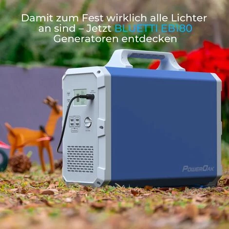 Poweroak EB180 tragbarer Stromgenerator hat eine große Kapazität von 1800wh und eine hohe Leistung von 1000W. Es kann verschiedene Arten von Stromverbrauch erfüllen und ist sehr geeignet als Home-Standby-Stromversorgung für Weihnachtsfeiern. Damit Sie Ihren Wunsch an Heiligabend erfüllen können.