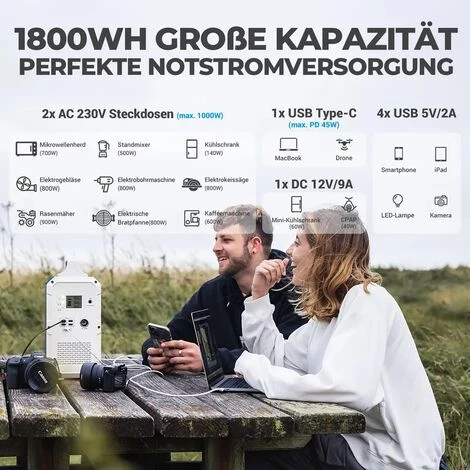 Bluetti EB180 Tragbares Kraftwerk hat 2 *220V AC Steckdose, die für die meisten Haushaltsgeräte unter 1000W geeignet ist, wie Mixer, TV, Haushaltstrockner und Notebook-Computer. 1 *DC12V ist einstellbar, geeignet für Autogeräte wie Mikrokühlschrank und automatischer Staubsauger, 1 *45W C ist für USB-c-Geräte wie Notebook Computer MacBook / macbook pro und Pd-C, und 4 *5v3a (Maximum) geeignet für Mobiltelefon, Tablet-Computer, Kamera, Ventilator, elektrische Lampe und andere Geräte, die einige tägliche Geräte beherbergen können, die weit verbreitet in Haushaltsgeräten und Bürogeräten, an Bord von Ausrüstung und Notstrom eingesetzt werden.
