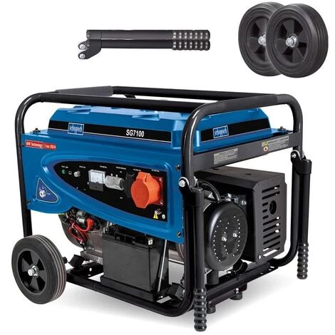 Der SG7100 Generator von Scheppach wird mit einem 420 cm³ 4-Takt-Motor angetrieben und liefert mit max. 5500 W ausreichend Strom für Arbeiten rund ums Haus oder auf der Baustelle. Dank stabilem Stahlrahmen, Fahrvorrichtung und ausklappbaren Handgriffen ist der Stromerzeuger mobil und vielseitig einsetzbar. Ein 25 Liter Benzintank sorgt für eine etwa 10-stündige Stromversorgung und dank des 400 V Stromanschlusses können Sie alle Maschinen betreiben.