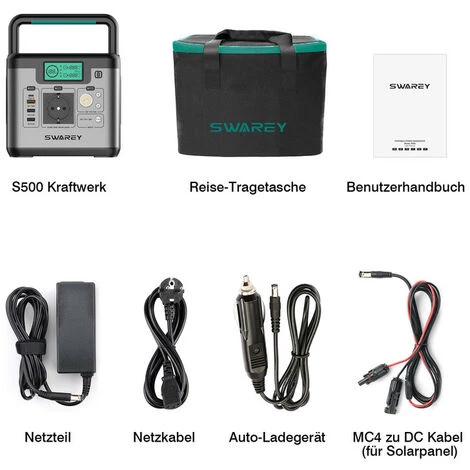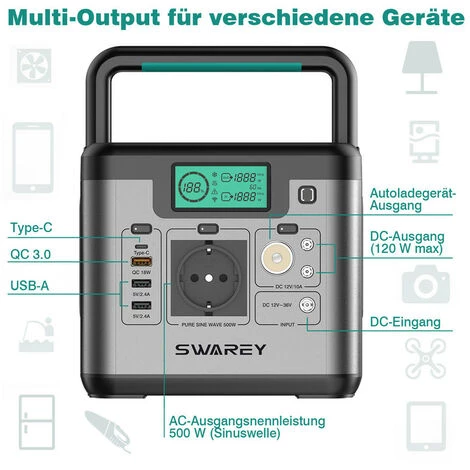 SWAREY S500 kann das Produkt auch mit einem Autoladegerät und einem Solarpanel zusätzlich zum Netzstrom aufladen, was einen ausreichenden Stromschutz für Wohnmobilreisen, Camping, Angeln, netzunabhängige Sicherung oder Stromausfälle zu Hause bietet. Ist Ihre ideale Wahl.