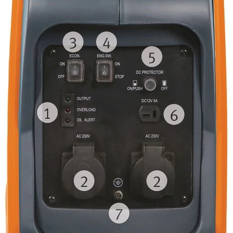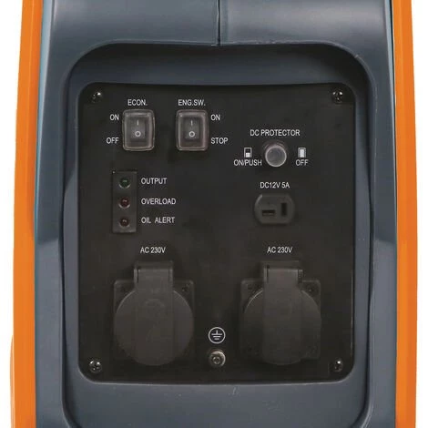 - Kontrollleuchten für Ausgangsspannung, Überlastung und Ölmangel